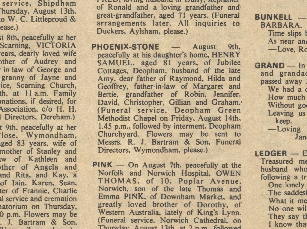 Although buried in Deopham churchyard, there is no memorial to Henry or Amy Phoenix-Stone.