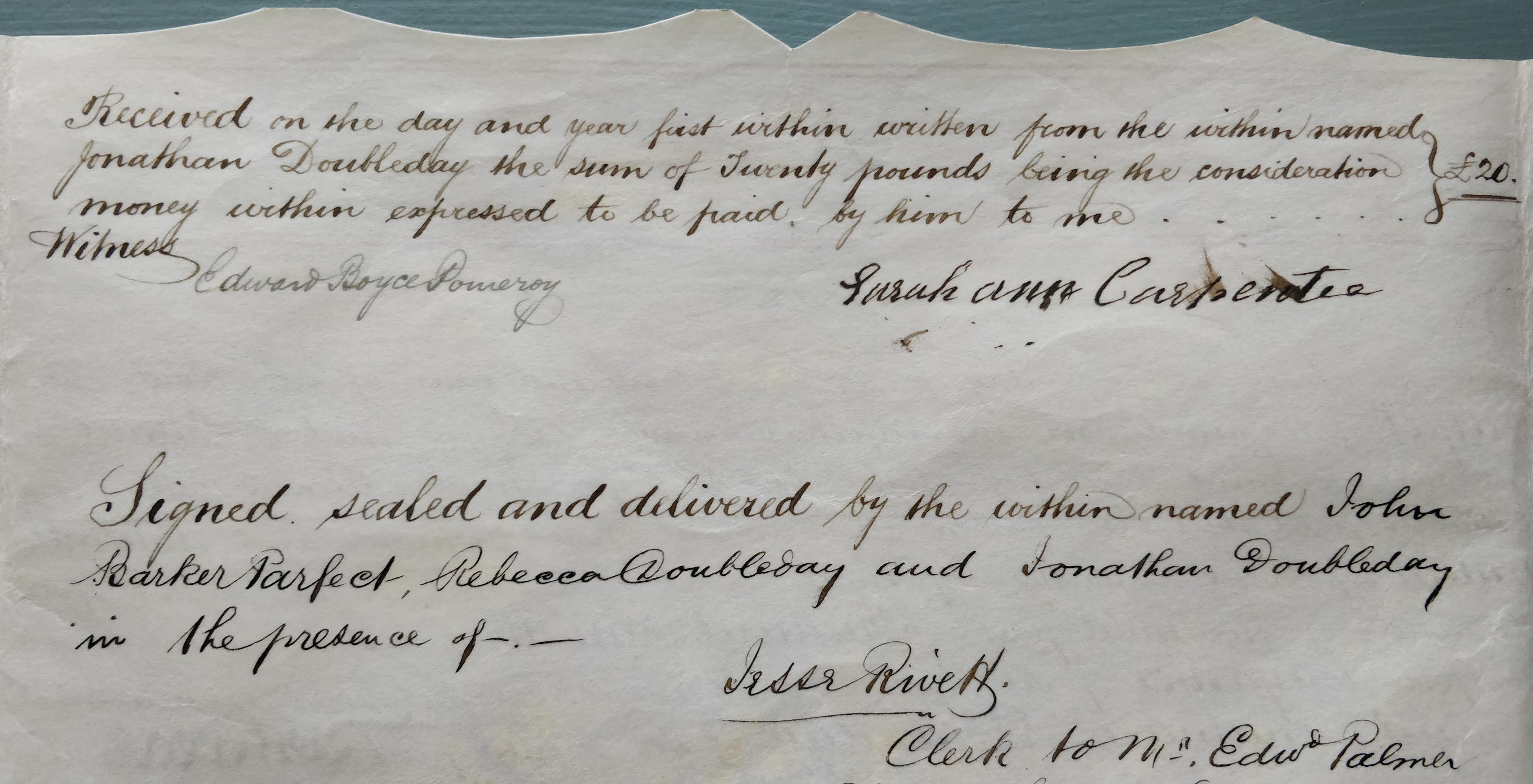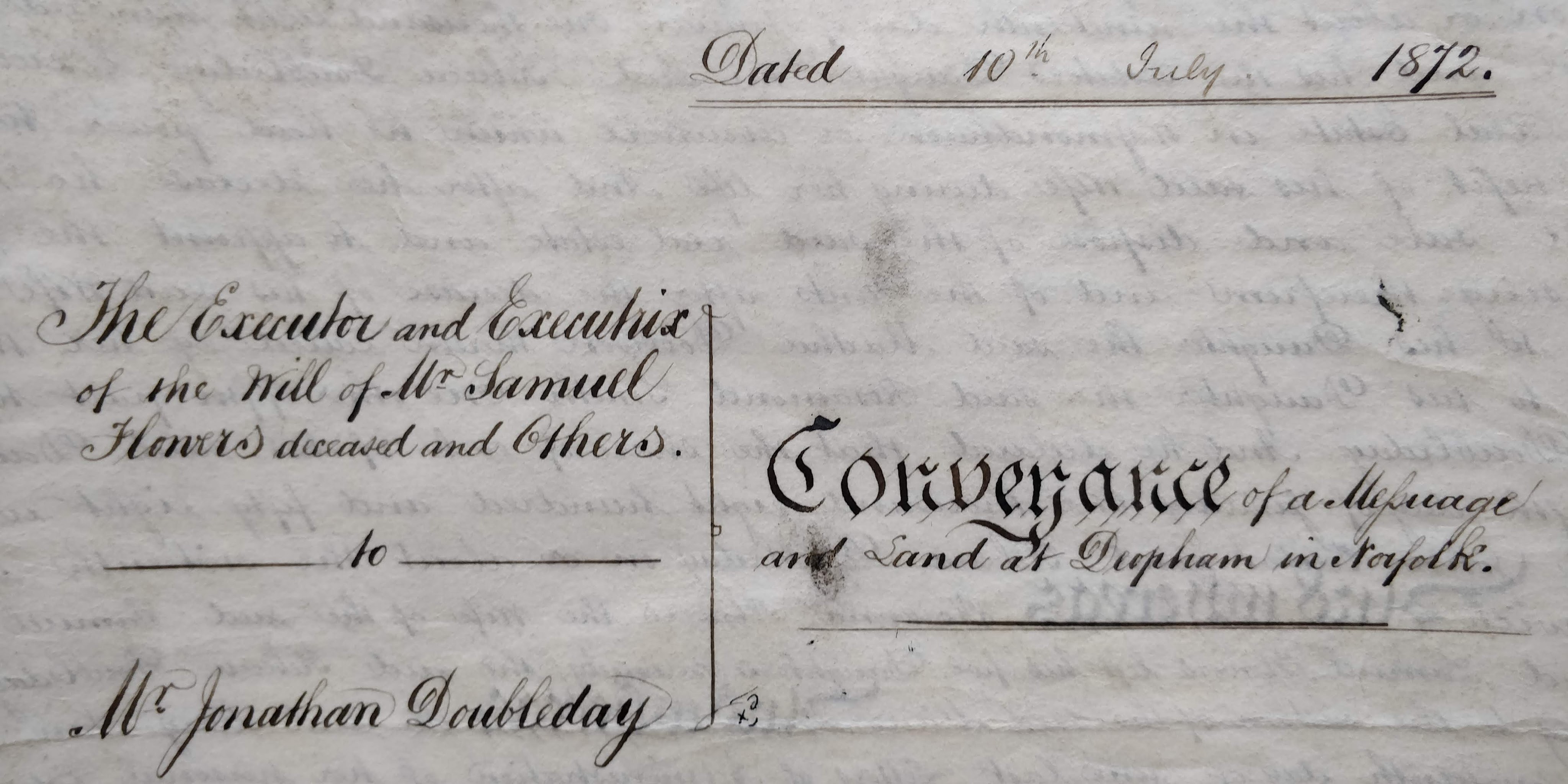 An Indenture of 1872 recorded that the four living sisters plus Henry Smith as husband and beneficiary of the fifth sister, agreed that Jonathan Doubleday should acquire all of the property of Samuel Flowers that had been left to the five sisters. The portion belonging to his wife Rebecca was handed over without any payment; the other four parties received £20 a piece.
