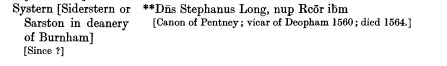 By 1554 he had become rector of Systern (most likely Syderstone – next to South Creake, and which is in the Deanery of Burnham near King’s Lynn3). When the Catholic Queen Mary required that all clergy should be single and celibate, Stephen Long was “unbeneficed” from Systern, as recorded in the Book of Deprivations4 :-