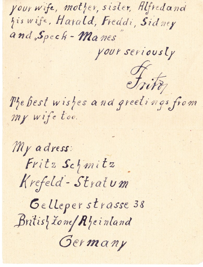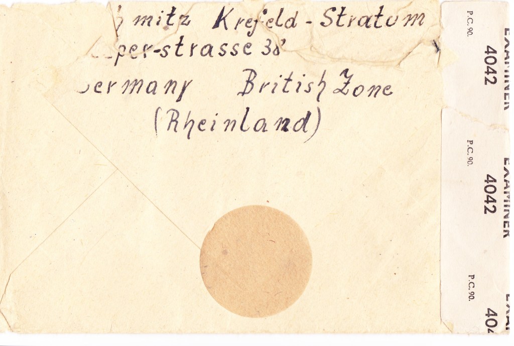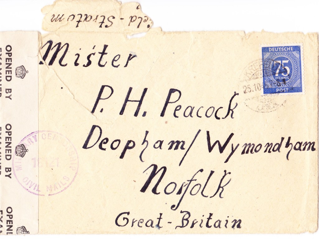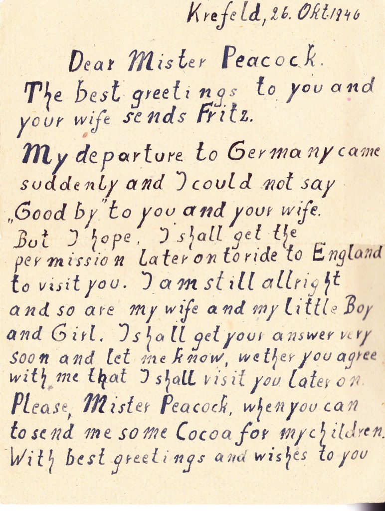 The following letter was sent to Mr. Percy Peacock by Fritz Schmitz. The tape down the left side of the envelope shows that it had been opened by British Government censors.