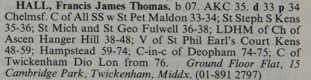 The following summary of the Rev. Francis Hall’s career appeared in the 1980-82 edition of Crockford’s Clerical Directory1: