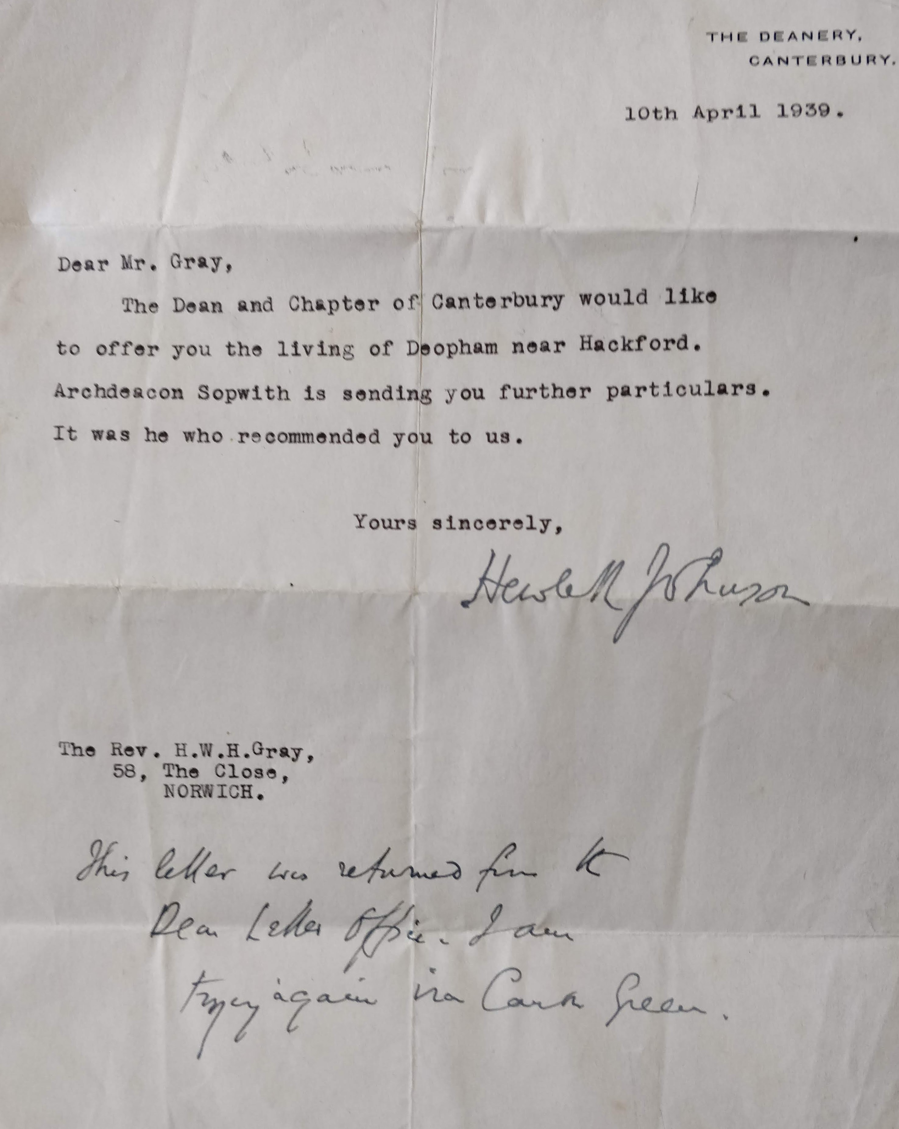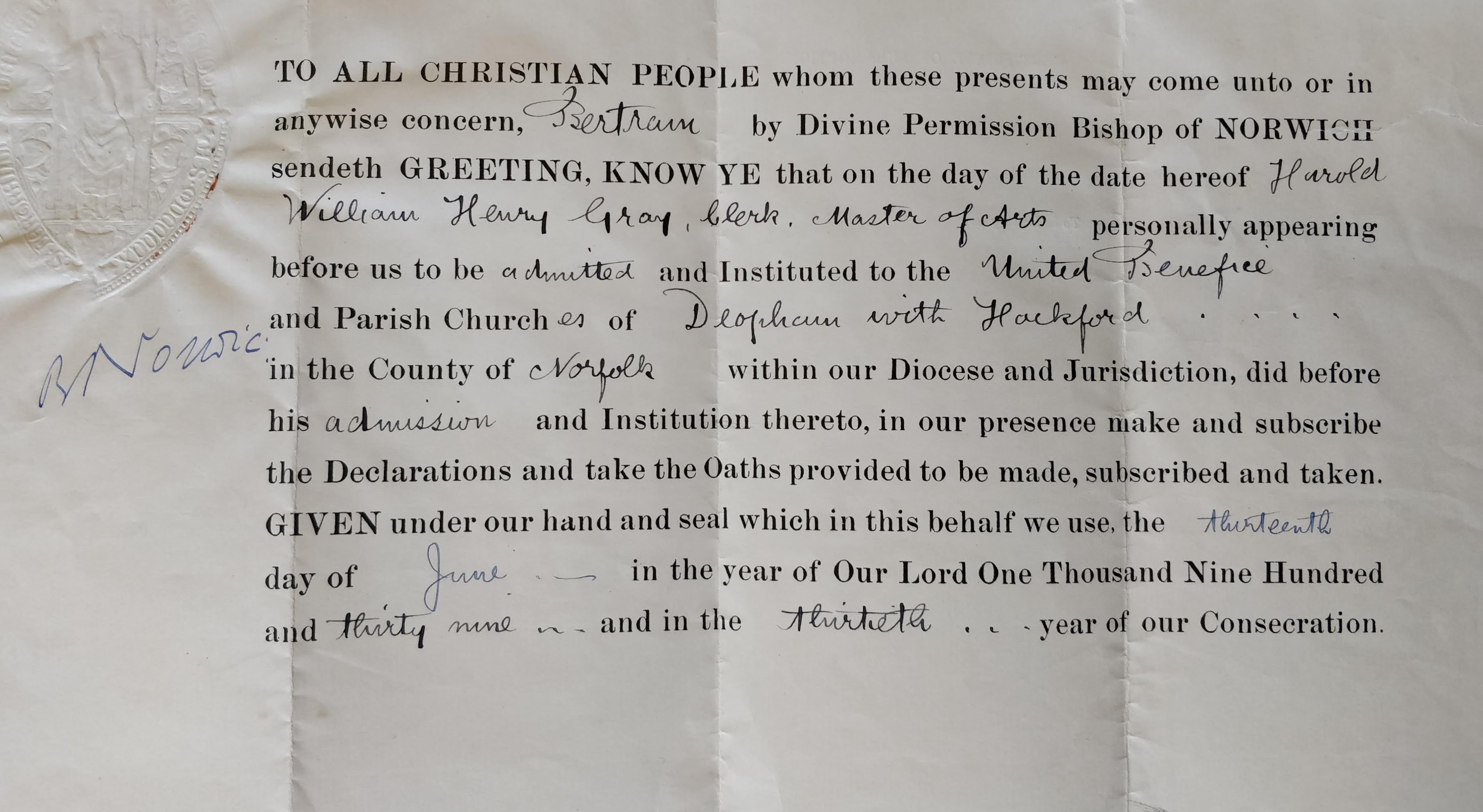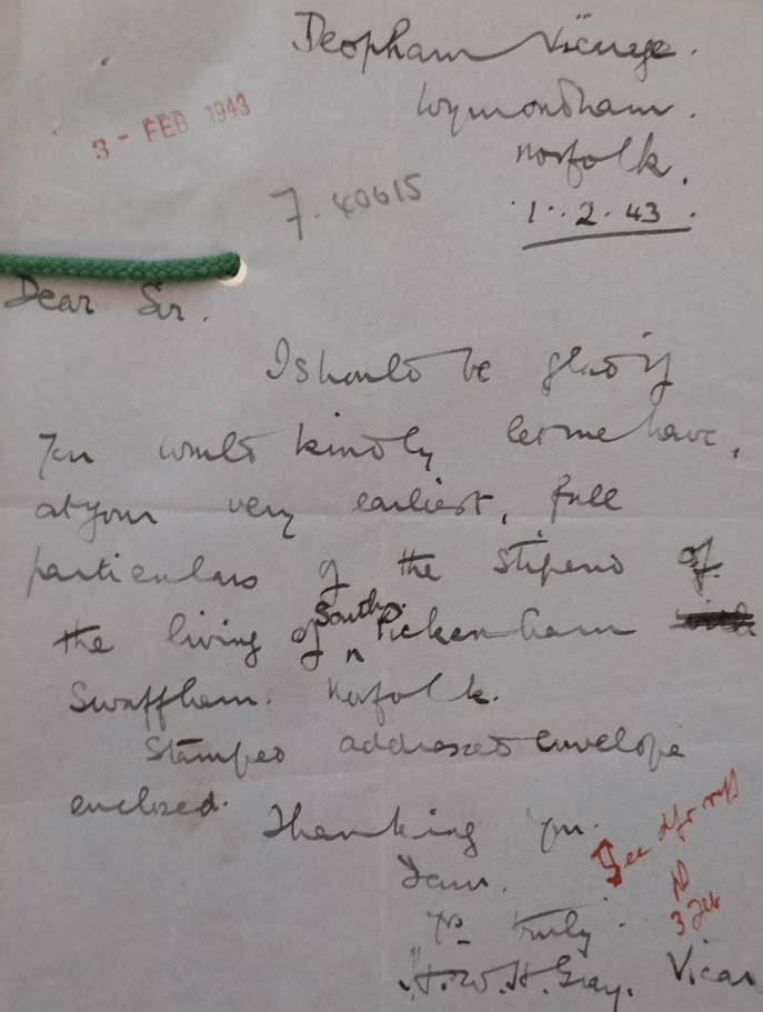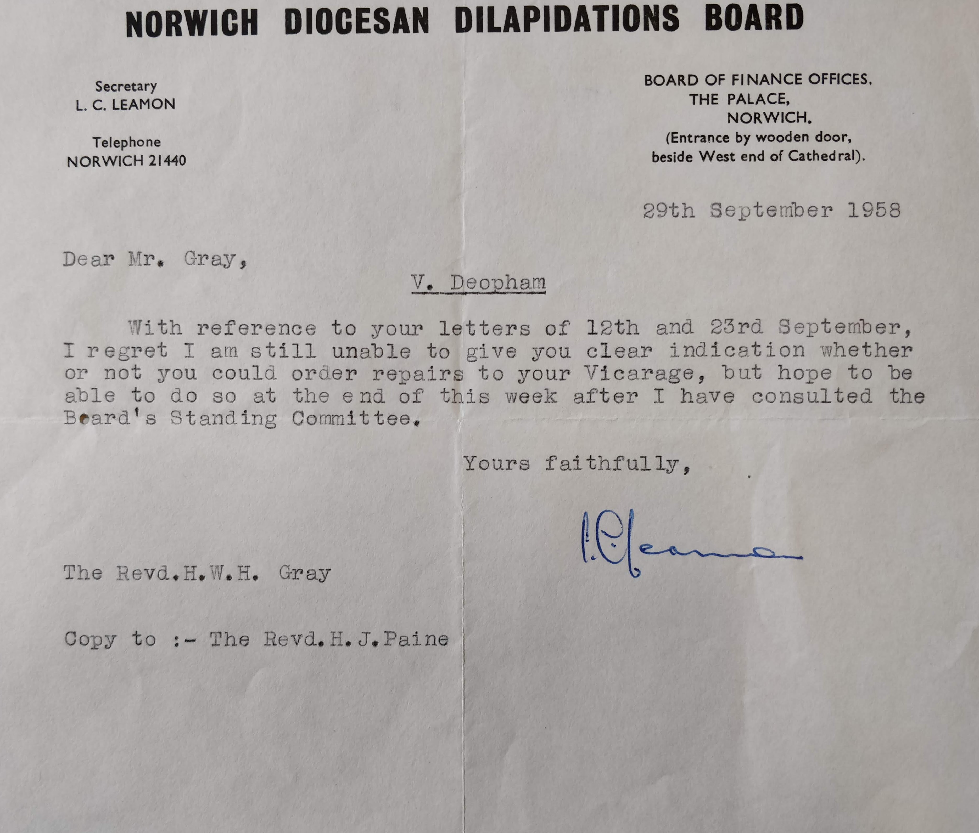 On February 1st 1943 the Rev. Harold Gray wrote to the Ecclesiastical Commissioners to ask for details of a vacancy at South Pickenham. It is not known why he did not take up this post, but remained at Deopham for another seventeen years.