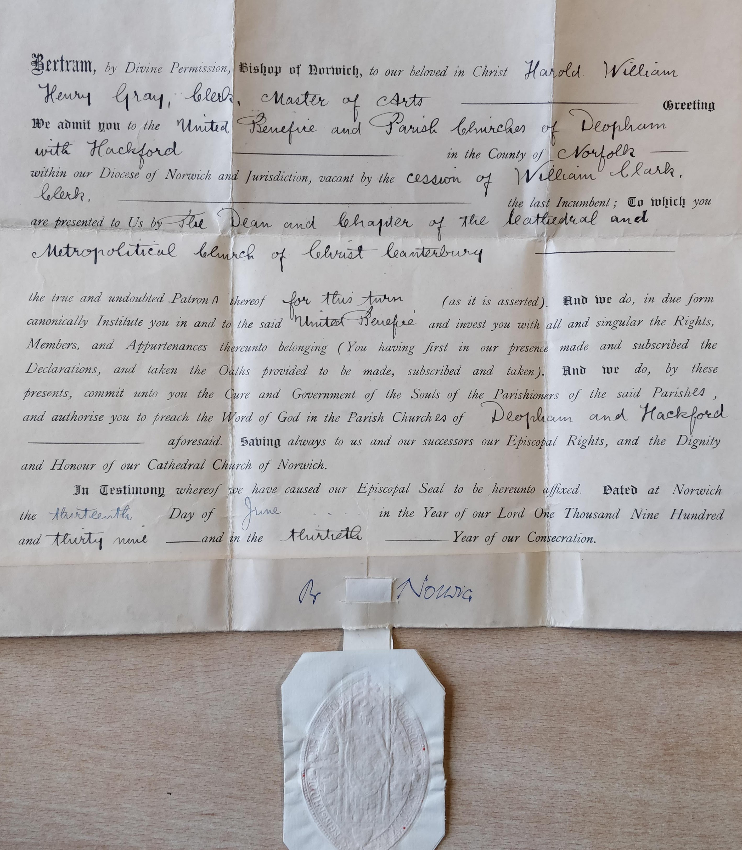 The Rev. Harold William Henry Gray, M.A., was instituted to the united benefice and Parish Churches of Deopham with Hackford on the presentation of the Dean and Chapter of Canterbury.