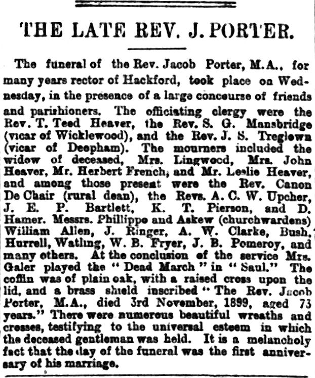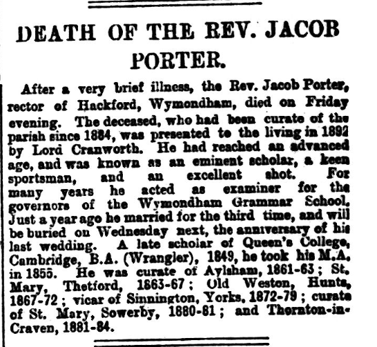 Curiously, two of his wives appear together on the same memorial inside Hackford church. The second wife2 died two years before the Rev. Jacob Porter; the report of his funeral says that the service took place on the day of his first wedding anniversary. This would confirm that he had a third wife3.