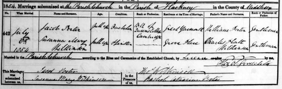 - The Rev. Jacob Porter had married Susannah (née Wilkinson) in 1854 at the Parish Church in Hackney: