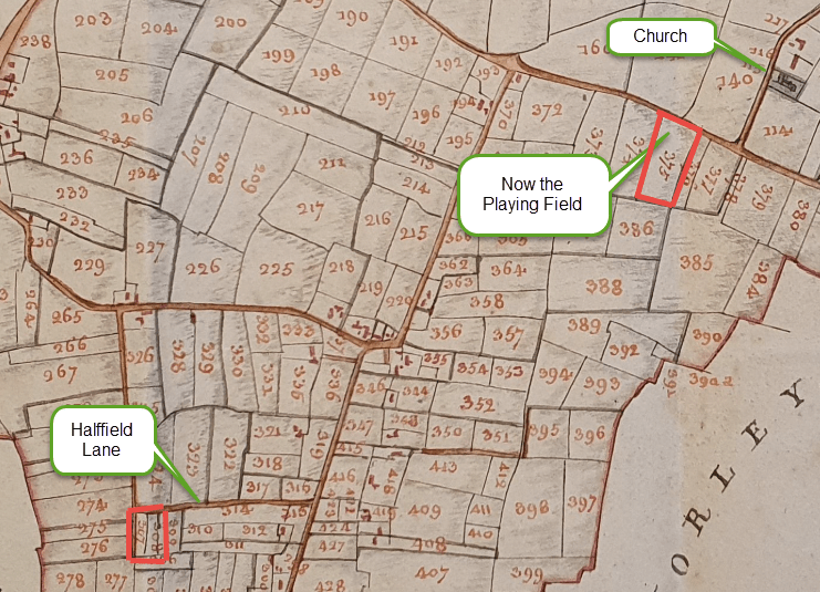 The 1815 survey recorded that there were five acres owned by the Trustees of Rix’s Charity and that these were occupied by Robert Curson. These were numbered 307, 308 & 375 on this survey. By the time of the 1941 Farm survey, the two small plots at the end of Halffield Lane had become part of the Half Moon pub’s estate as is shown here.