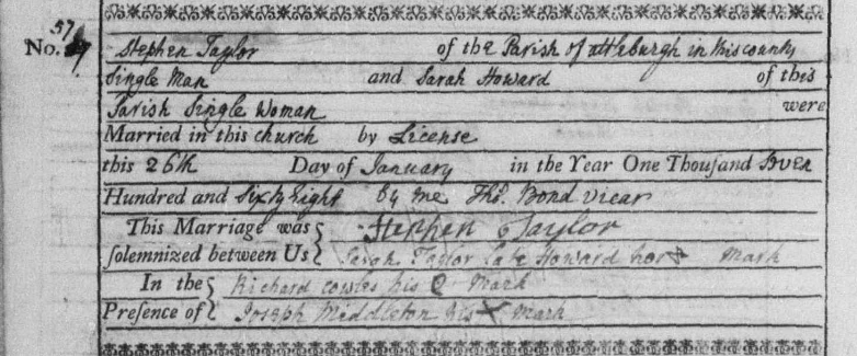 Stephen Taylor was married on January 26th 1768 in Gt. Ellingham to Sarah Howard.
