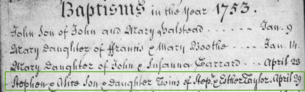 Stephen was baptised along with his twin Alice on April 29th 1753:
