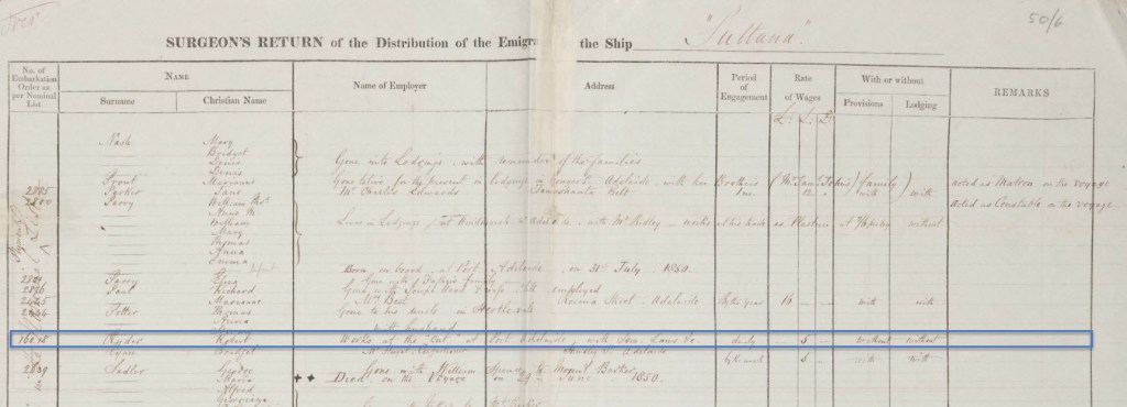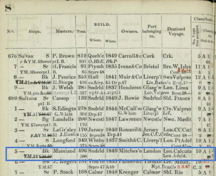 The Lloyds Register of Shipping for 1850 lists the Sultana as below; this shows the Master as being Mainland, which matches the Commander’s signature on the list above:-