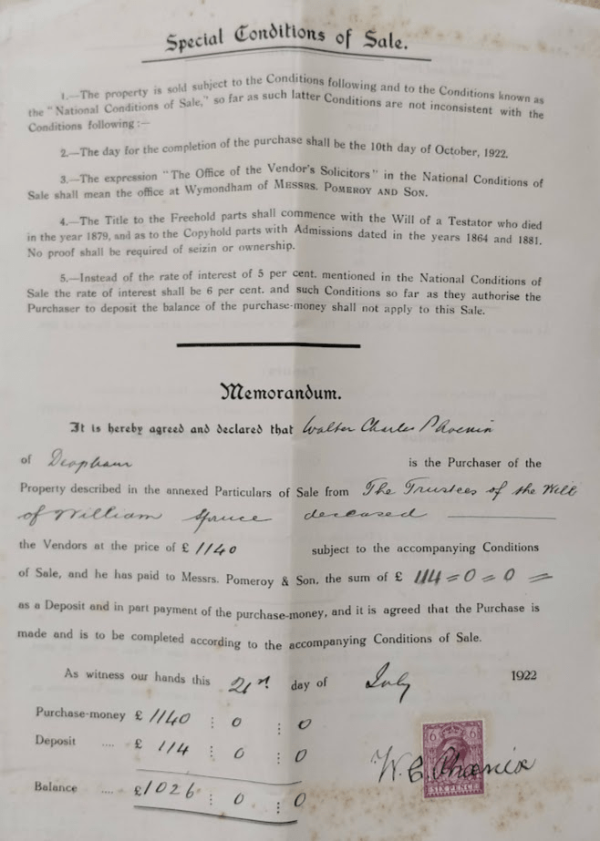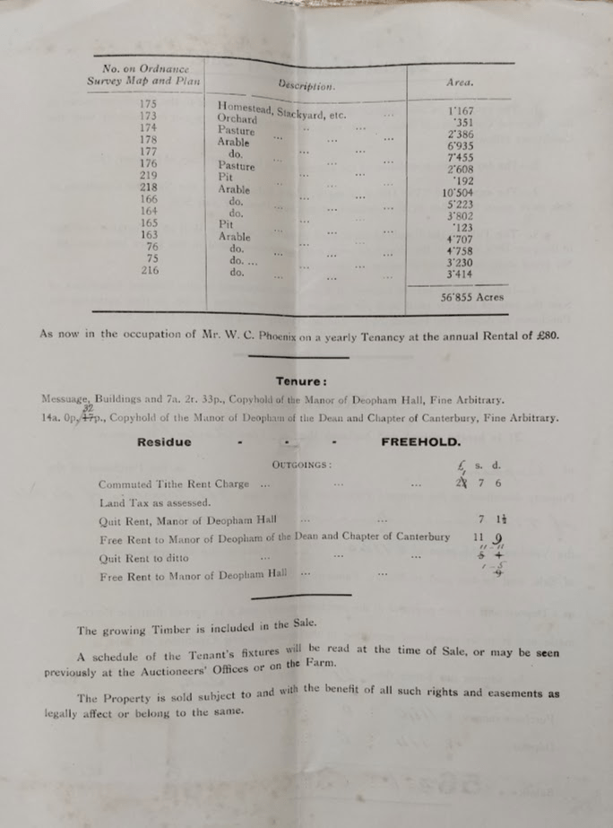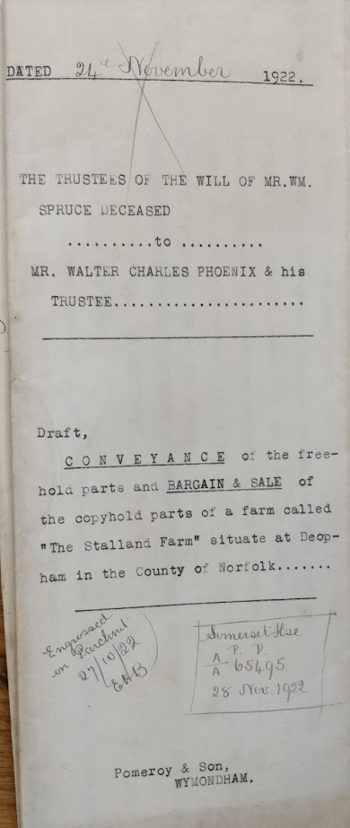 When Walter Charles Phoenix purchased The Stalland Farm in 1922, three pieces of land were copyhold of the Manor of Deopham of the Dean & Chapter of Canterbury, and one piece was copyhold of the Manor of Deopham Hall. These were held in trust by Gertrude Helen Phoenix (Walter Charles Phoenix’s daughter) until the enfranchisement had been completed. Enfranchisement was the process by which the copyholder was able to buy out the Manor and remove all manorial constraints on the land.
