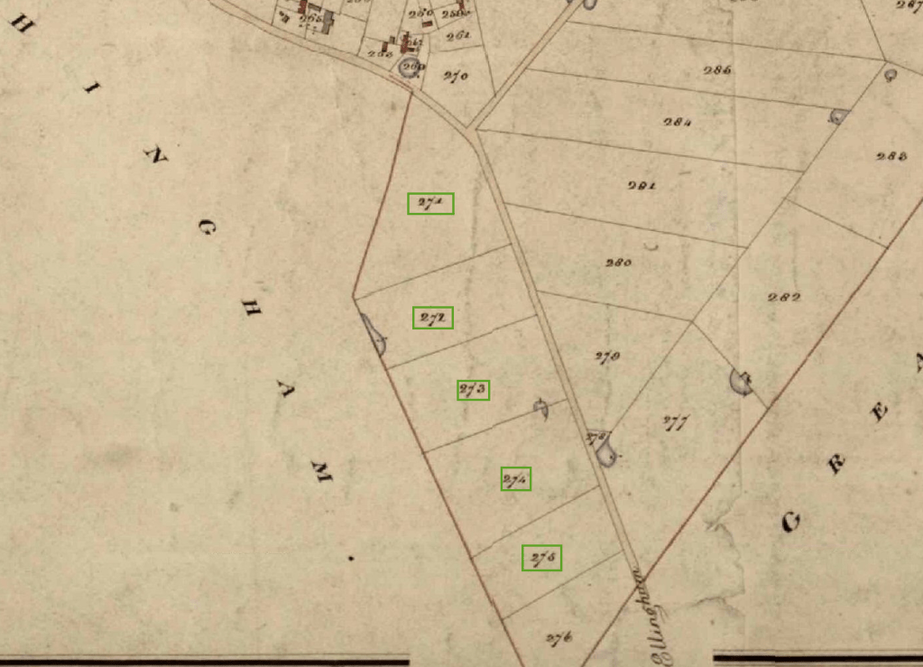 The particulars of “Lot 1” in the above documents list eight plots identified and numbered according to the tithe map. An extract from that map of 1843 shows the location of each of these plots:-