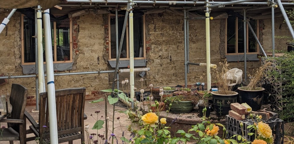 The following photograph shows The Stalland Farm during building works with the outer brickwork removed. Behind this is a wall of clay lump. There must be several buildings in Deopham which appear to be brick built, but which have mud walls behind the brick outer skin.