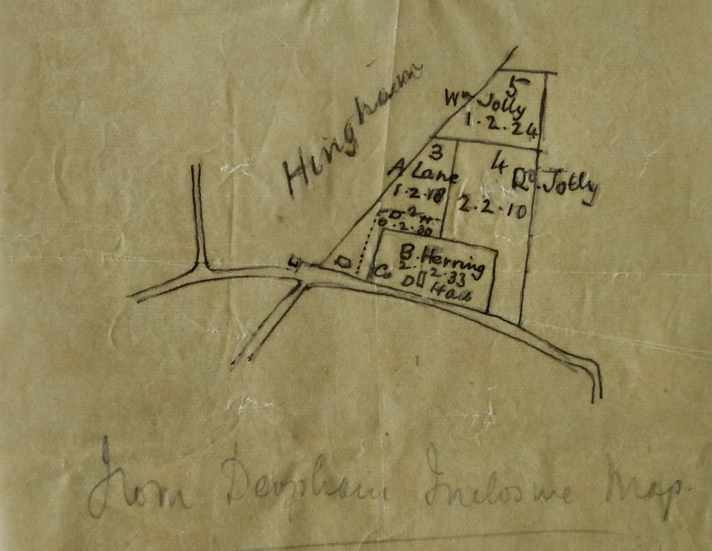 The 1899 sale particulars for Sunnyside Farm included a plan identifying that 2 roods and 30 perches were copyhold of the Manor of Deopham Hall; this was shown on the 1814 Inclosures plan as piece no 2. The Copyhold Act of 1852 allowed Copyhold tenants to demand enfranchisement – a process whereby they were freed from all Copyhold obligations. The 1852 Act went through subsequent revisions reducing the ability of Lords of the Manor to retain controls over assets that were previously Copyhold.