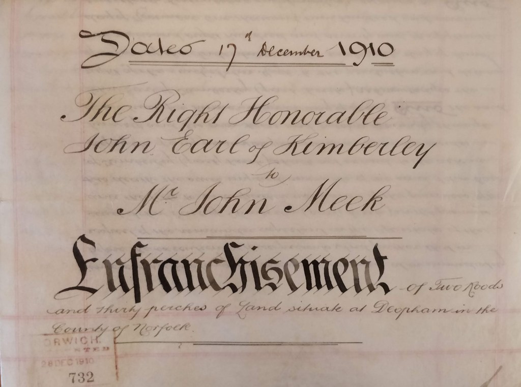 On December 17th 1910 the Earl of Kimberley signed a Deed of Enfranchisement transferring all rights on the 2 roods and 30 perches to John Meek in return for a payment of £8 2s 6d.