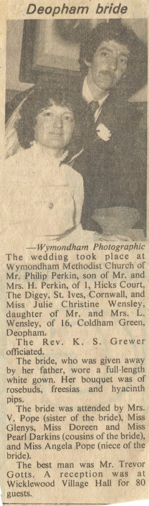 The wedding took place at Wymondham Methodist Church of Mr. Philip Perkin, son of Mr. and Mrs. H. Perkin, of 1, Hicks Court, The Digey, St. Ives, Cornwall, and Miss Julie Christine Wensley, daughter of Mr. and Mrs. L. Wensley, of 16, Coldham Green, Deopham.