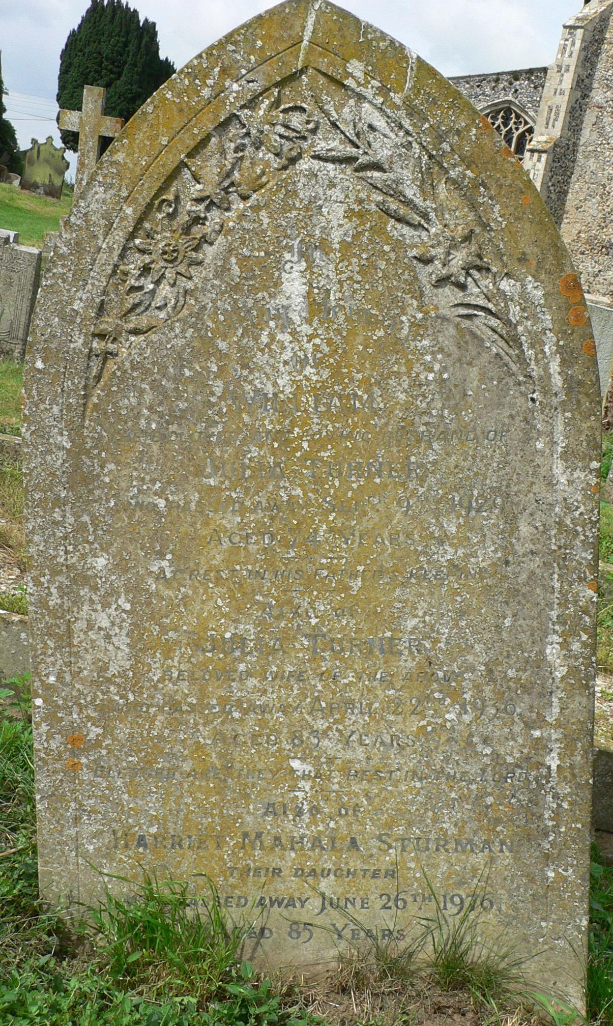 “In memory of WILLIAM the beloved husband of JULIA TURNER who passed away Sept 9th 1929 aged 74 years”. The full text of this memorial is reproduced here.