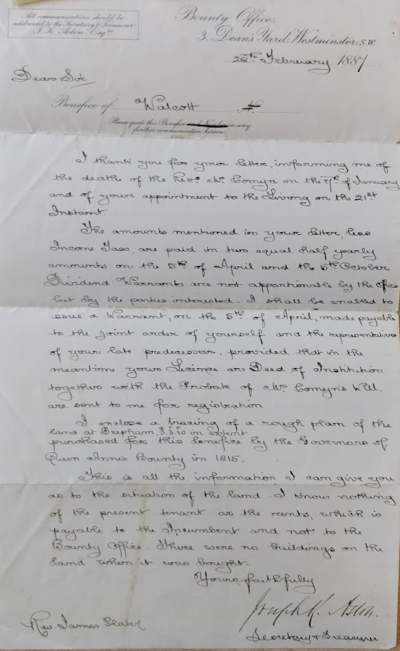 White’s History, Gazetteer & Directory of Norfolk, 1883 states of Witton that “The vicarage … was augmented with £400 of Queen Anne’s bounty in 1767 and 1786“. It also states of Walcot that the vicarage “was augmented in 1800 and 1817 with £600 of Q.A.B.” It remains to be identified where either parish invested these sums until 1815, but it appears that they joined forces then and acquired land in Deopham.