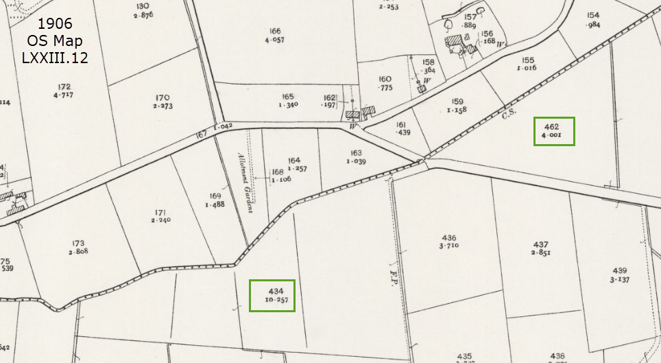 The following extract from OS Map LXXIII.12 shows the Witton and Walcott plots. The Witton land is plot 462 and the Walcot land is plot 434.