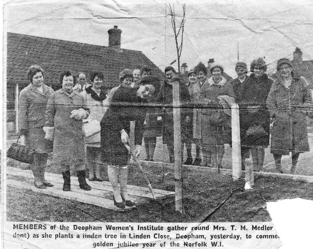 The planting ceremony (at Linden Close, Deopham) was attended by not only W.I. people, but representatives of the Forehoe and Henstead R.D.C., the Parish Council, parishioners and children from the County Primary School.